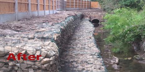 Culvet cleaning and de-silting of water course. Excavation and installation of Gabion cages. For pre-adoption by United Utilities.
